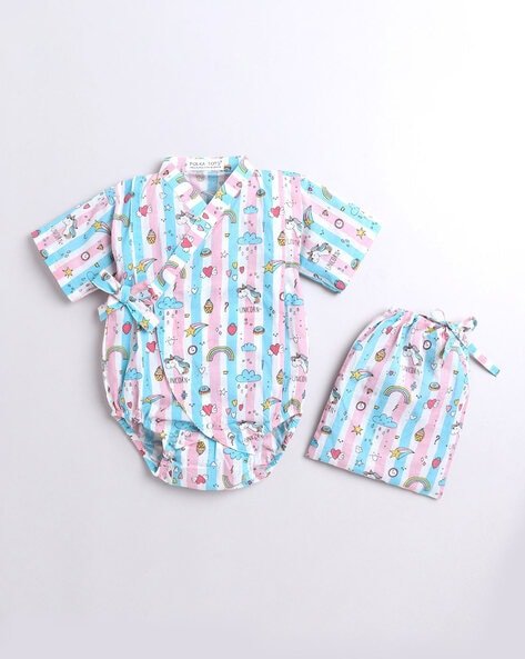 Buy now Printed Wrap Onesie & Bloomers Set byPOLKA TOTSonly through BabyRompers.in – Get The Best Deals & Offers!